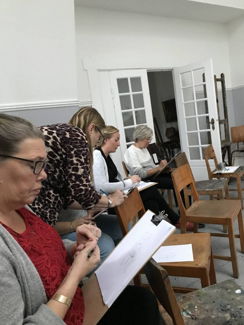 Grundkursus i tegning og maling for voksnen gruppe i kunstneren Lotte Kjøllers eget atelier. Basic course in drawing and painting for adults group in the artist Lotte Kjoeller's own studio.